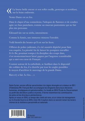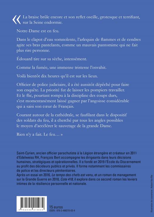« La braise brûle encore et son reflet oscille, grotesque et terrifiant, sur la Seine endormie. Notre-Dame est en feu. Dans le clapot d’eau somnolente, l’arlequin de flammes et de cendres agite ses bras pantelants, comme un mauvais pantomime qui ne fait plus rire personne. Edouard tire sur sa sèche, intensément. Comme la fumée, une immense tristesse l’envahit. Voilà bientôt dix heures qu’il est sur les lieux. Officier de police judiciaire, il a été aussitôt dépêché pour faire son enquête. La priorité fut de laisser les pompiers travailler. Et le flic, pourtant rompu à la discipline des coups durs, s’est momentanément laissé gagner par l’angoisse considérable qui a saisi son cœur de Français. Courant autour de la cathédrale, se faufilant dans le dispositif des soldats du feu, il a cherché par tous les angles possibles le moyen d’accélérer le sauvetage de la grande Dame. Rien n’y a fait. Le feu… »