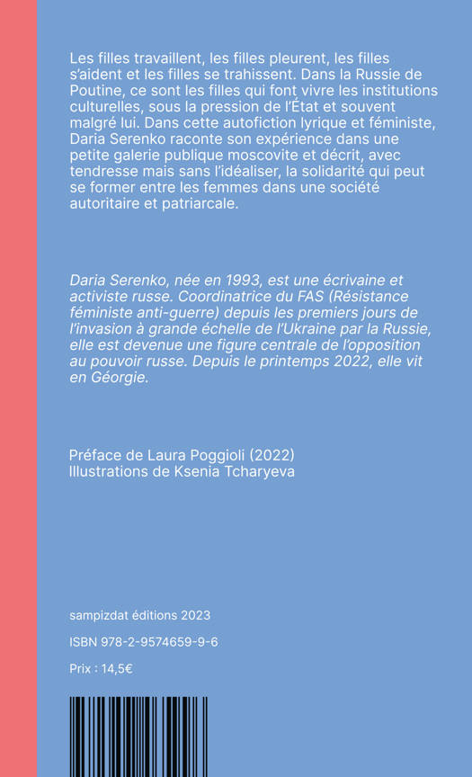 Les filles travaillent, les filles pleurent, les filles s’aident et les filles se trahissent. Dans la Russie de Poutine, ce sont les filles qui font vivre les institutions culturelles, sous la pression de l’État et souvent malgré lui. Dans cette autofiction lyrique et féministe, Daria Serenko raconte son expérience dans une petite galerie publique moscovite et décrit, avec tendresse mais sans l’idéaliser, la solidarité qui peut se former entre les femmes dans une société autoritaire et patriarcale.<br /><br /> Daria Serenko, née en 1993, est une écrivaine et activiste russe. Coordinatrice du FAS (Résistance féministe anti-guerre) depuis les premiers jours de l’invasion à grande échelle de l’Ukraine par la Russie, elle est devenue une figure centrale de l’opposition au pouvoir russe. Depuis le printemps 2022, elle vit en Géorgie.<br />