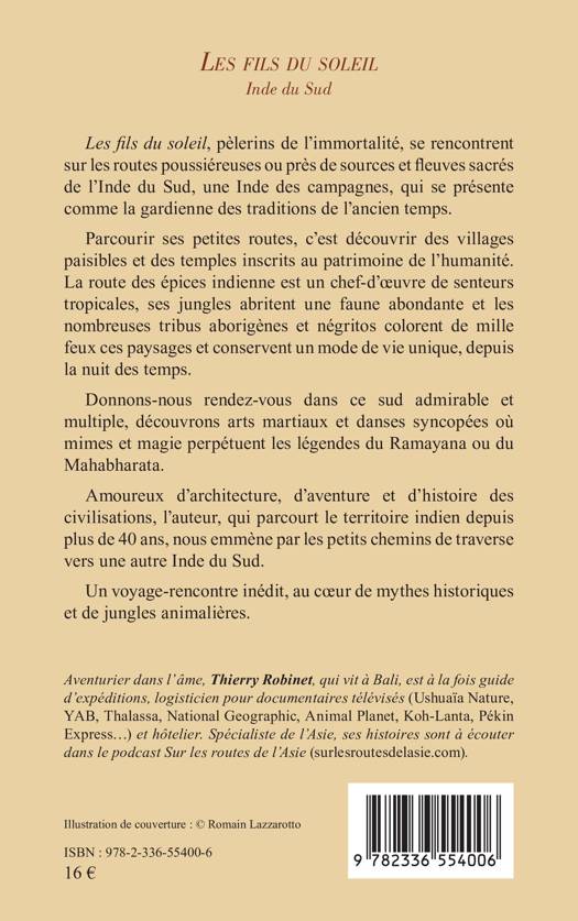Les fils du soleil, pèlerins de l'immortalité, se rencontrent sur les routes poussiéreuses ou près de sources et fleuves sacrés de l'Inde du Sud, une Inde des campagnes, qui se présente comme la gardienne des traditions de l'ancien temps. Parcourir ses petites routes, c'est découvrir des villages paisibles et des temples inscrits au Patrimoine de l'Humanité. La route des épices indienne est un chef-d'oeuvre de senteurs tropicales, ses jungles abritent une faune abondante et les nombreuses tribus aborigènes et négritos colorent de mille feux ces paysages et conservent un mode de vie unique, depuis la nuit des temps. Donnons-nous rendez-vous dans ce sud admirable et multiple, découvrons arts martiaux et danses syncopées où mimes et magie perpétuent les légendes du Ramayana ou du Mahabharata. Amoureux d'architecture, d'aventure et d'histoire des civilisations, l'auteur qui parcourt le territoire indien depuis plus de 40 ans, nous emmène par les petits chemins de traverse vers une autre Inde du Sud. Un voyage-rencontre inédit, au coeur de mythes historiques et de jungles animalières.
