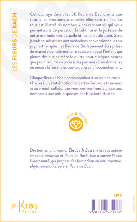 Cet ouvrage décrit les 38 fleurs de Bach, ainsi que toutes les émotions auxquelles elles sont reliées. Le tout est illustré de nombreux cas rencontrés qui vous permettront de percevoir la subtilité et la justesse de cette méthode très actuelle et facile d’utilisation. Sans jamais se substituer aux médecines allopathiques, homéopathiques ou autres, les fleurs de Bach sont un excellent complément de traitement, aussi bien pour l'enfant qui pleure dès que sa mère le quitte pour quelques heures que pour l'adulte en proie à des pensées obsessionnelles ou encore la femme enceinte qui craint l'accouchement. Chaque fleur de Bach correspondant à un trait de caractère ou à un état émotionnel particulier, vous trouverez assurément celle qui vous convient grâce aux nombreux conseils dispensés par Élisabeth Busser.