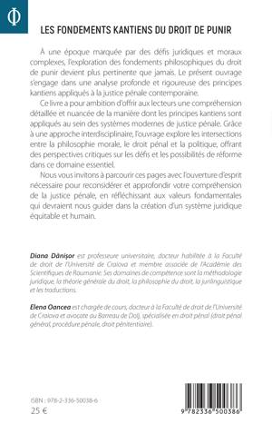 À une époque marquée par des défis juridiques et moraux complexes, l'exploration des fondements philosophiques du droit de punir devient plus pertinente que jamais. Le présent ouvrage s'engage dans une analyse profonde et rigoureuse des principes kantiens appliqués à la justice pénale contemporaine. Ce livre a pour ambition d'offrir aux lecteurs une compréhension détaillée et nuancée de la manière dont les principes kantiens sont appliqués au sein des systèmes modernes de justice pénale. Grâce à une approche interdisciplinaire, l'ouvrage explore les intersections entre la philosophie morale, le droit pénal et la politique, offrant des perspectives critiques sur les défis et les possibilités de réforme dans ce domaine essentiel. Nous vous invitons à parcourir ces pages avec l'ouverture d'esprit nécessaire pour reconsidérer et approfondir votre compréhension de la justice pénale, en réfléchissant aux valeurs fondamentales qui devraient nous guider dans la création d'un système juridique équitable et humain.