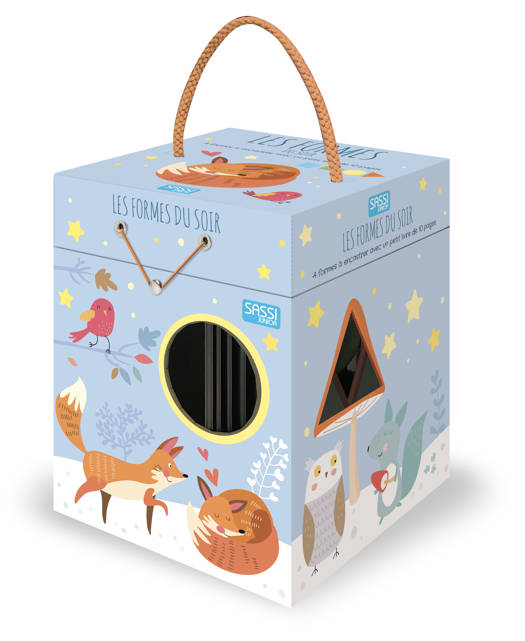 A l'heure où la nuit tombe, les animaux se préparent à se coucher. Avec des formes à encastrer dans des cubes pour compléter le décor.