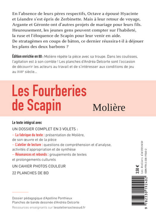 En l'absence de leurs pères respectifs, Octave a épousé Hyacinte et Léandre s'est épris de Zerbinette. Mais à leur retour de voyage, Argante et Géronte ont d'autres projets de mariage pour leurs fils. Heureusement, les jeunes gens peuvent compter sur l'habileté, la ruse et l'éloquence de Scapin pour leur venir en aide. De stratagèmes en coups de bâton, ce dernier réussira-t-il à déjouer les plans des deux barbons ? Édition enrichie en BD : Molière répète la pièce avec sa troupe. Dans les coulisses, l'agitation est à son comble ! Les 22 planches d'Andréa Delcorte sont l'occasion de découvrir les acteurs au travail et de s'intéresser aux conditions de jeu au XVIIe siècle... Ce volume contient aussi : UN DOSSIER COMPLET EN 3 VOLETS : - La fabrique du texte : présentation de l'auteur, de la pièce et de ses enjeux - L'atelier de lecture : questions de compréhension et d'analyse, activités d'appropriation et de synthèse - Résonances et rebonds : groupements de textes (« Drôles de fourbes ! » et « Les conflits de générations au théâtre ») et initiation à l'histoire des arts UN CAHIER PHOTOS COULEUR