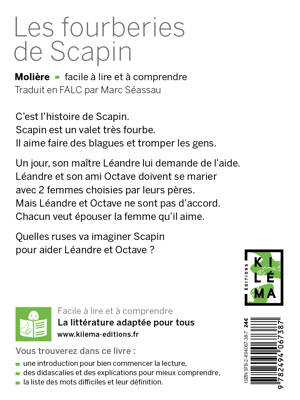 UN LIVRE FACILE À LIRE ET À COMPRENDREC’est l’histoire de Scapin.Scapin est un valet très fourbe.Il aime faire des blagues et tromper les gens.Un jour, son maître Léandre lui demande de l’aide.Léandre et son ami Octave doivent se marierave 2 femmes choisies par leurs pères.Mais Léandre et Octave ne sont pas d’accord.Chacun veut épouser la femme qu’il aime.Quelles ruses va imaginer Scapinpour aider Léandre et Octave ?