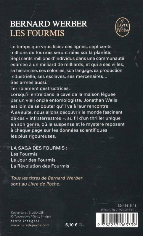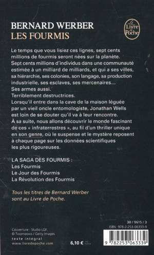 Le temps que vous lisiez ces lignes, sept cents millions de fourmis seront nées sur la planète. Sept cents millions d'individus dans une communauté estimée à un milliard de milliards, et qui a ses villes, sa hiérarchie, ses colonies, son langage, sa production industrielle, ses esclaves, ses mercenaires... Ses armes aussi. Terriblement destructrices. Lorsqu'il entre dans la cave de la maison léguée par un vieil oncle entomologiste, Jonathan Wells est loin de se douter qu'il va à leur rencontre. A sa suite, nous allons découvrir le monde fabuleusement riche, monstrueux et fascinant de ces «infraterrestres», au fil d'un thriller unique en son genre, où le suspense et l'horreur reposent à chaque page sur les données scientifiques les plus rigoureuses. Voici pour la première fois un roman dont les héros sont des... fourmis !