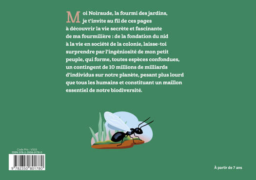 Moi Noiraude, la fourmi des jardins, je t’invite au fil de ces pages à découvrir la vie secrète et fascinante de ma fourmilière : de la fondation du nid à la vie en société de la colonie, laisse-toi surprendre par l’ingéniosité de mon petit peuple, qui forme, toutes espèces confondues, un contingent de 10 millions de milliards d’individus sur notre planète, pesant plus lourd que tous les humains et constituant un maillon essentiel de notre biodiversité.