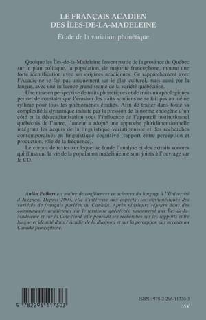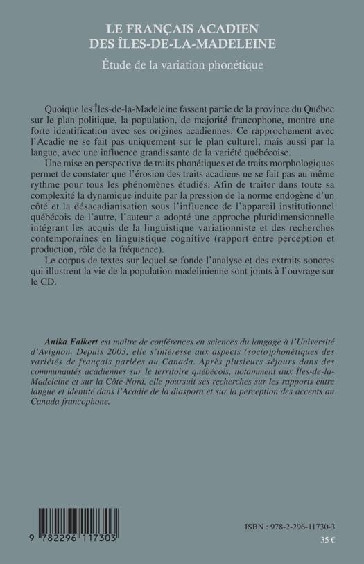 Quoique les Iles-de-la-Madeleine fassent partie de la province du Québec sur le plan politique, la population, de majorité francophone, montre une forte identification avec ses origines acadiennes. Ce rapprochement avec l'Acadie ne se fait pas uniquement sur le plan culturel, mais aussi par la langue, avec une influence grandissante de la variété québécoise. Le corpus de textes sur lequel se fonde l'analyse et des extraits sonores qui illustrent la vie de la population madelinienne sont joints à l'ouvrage sur un CD.