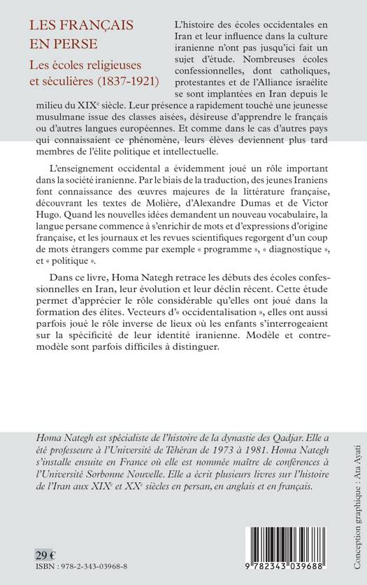 De nombreuses écoles confessionnelles, dont des catholiques, des protestantes et de l'Alliance israélite se sont implantées en Iran depuis le début du XIXe siècle. Cette étude retrace le début de ces écoles, leur évolution et leur déclin récent. Elle permet d'apprécier le rôle considérable qu'elles ont joué dans la formation des élites. Vecteurs d'"occidentalisation", elles ont aussi parfois joué le rôle inverse de lieux où les enfants s'interrogeaient sur la spécificité de leur identité iranienne.