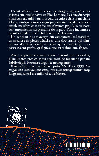 Avec ce premier roman aussi hilarant que déchainé, Elise Fugler met en mot son goût de l’absurde par un habile équilibre entre argot et néologismes. Nominé au prix du premier polar SNCF en 1999, Les frigos ont horreur du vide, resté au frais pendant troplongtemps, revient enfin chez Le Morse.