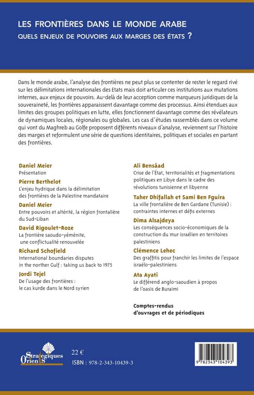Au-delà de leur acception comme marqueurs juridiques de la souveraineté, les frontières apparaissent davantage comme des processus. Ainsi étendues aux limites des groupes politiques en lutte, elles fonctionnent comme des révélateurs de dynamiques locales, régionales ou globales. Les cas d'études rassemblés dans ce volume qui vont du Maghreb au Golfe proposent différents niveaux d'analyse, reviennent sur l'histoire des marges et reformulent une série de questions identitaires, politiques et sociales en partant des frontières.