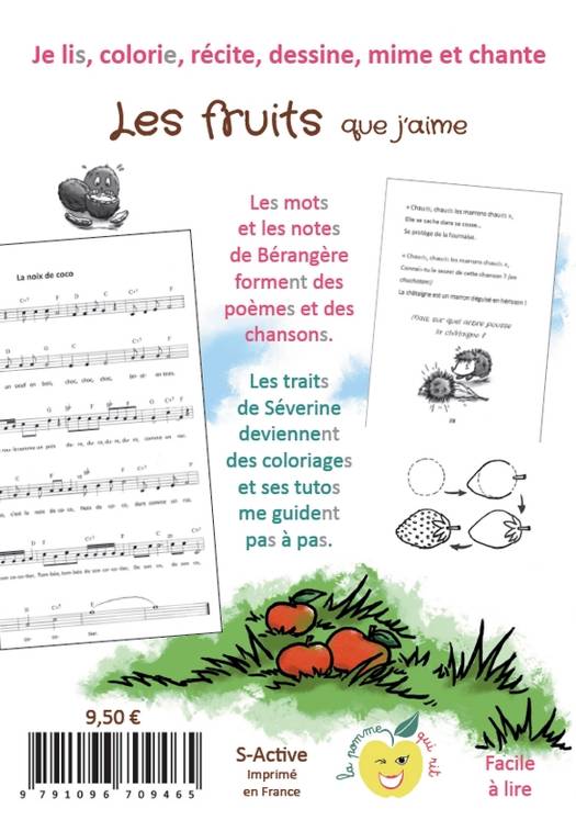 21 poèmes sur le thème des fruits : au pays de Vitamine, l'abricot, la banane, le cerise, la pastèque, la fraise, la kiwi, petite pomme, la châtaigne, le melon, l'alphabet des fruits, la groseille, la noisette, la mirabelle, la poire, la noix de coco, le raisin, la mûre, l'ananas, la figue et la prune sont complétés par des illustrations à colorier, des tutos pour dessiner et des mélodies (partitions incluses et enregistrements téléchargeables en version chantée ou en version instrumentale à l'aide d'un qrcode contenu dans l'ouvrage) pour écouter ou chanter. De 3 ans à 10 ans, chaque artiste en herbe y trouvera intérêt. Cet ouvrage est adapté aux enfants présentant des difficultés de lecture ou des troubles de type DYS, TDA et TSA Son approche artistique transversale met en action les différents sens de l'enfant, multipliant les possibilités de l'intéresser et d'éveiller sa créativité