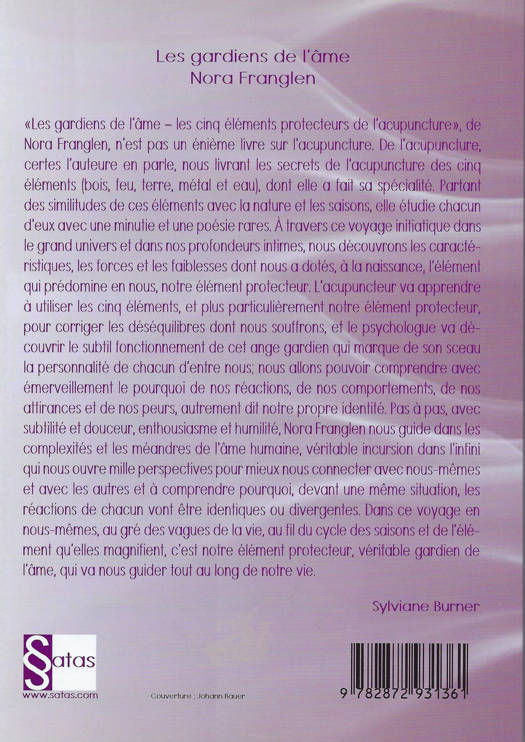 "Les gardiens de l'âme - les cinq éléments protecteurs de l'acupuncture", de Nora Franglen, n'est pas un énième livre sur l'acupuncture. De l'acupuncture, certes l'auteure en parle, nous livrant les secrets de l'acupuncture des cinq éléments (bois, feu, terre, métal et eau), dont elle a fait sa spécialité. Partant des similitudes de ces éléments avec la nature et les saisons, elle étudie chacun d'eux avec une minutie et une poésie rares. A travers ce voyage initiatique dans le grand univers et dans nos profondeurs intimes, nous découvrons les caractéristiques, les forces et les faiblesses dont nous a dotés, à la naissance, l'élément qui prédomine en nous, notre élément protecteur. L'acupuncteur va apprendre à utiliser les cinq éléments, et plus particulièrement notre élément protecteur, pour corriger les déséquilibres dont nous souffrons, et le psychologue va découvrir le subtil fonctionnement de cet ange gardien qui marque de son sceau la personnalité de chacun d'entre nous ; nous allons pouvoir comprendre avec émerveillement le pourquoi de nos réactions, de nos comportements, de nos attirances et de nos peurs, autrement dit notre propre identité. Pas à pas, avec subtilité et douceur, enthousiasme et humilité, Nora Franglen nous guide dans les complexités et les méandres de l'âme humaine, véritable incursion dans l'infini qui nous ouvre mille perspectives pour mieux nous connecter avec nous-mêmes et avec les autres et à comprendre pourquoi, devant une même situation, les réactions de chacun vont être identiques ou divergentes. Dans ce voyage en nous-mêmes, au gré des vagues de la vie, au fil du cycle des saisons et de l'élément qu'elles magnifient, c'est notre élément protecteur, véritable gardien de l'âme, qui va nous guider tout au long de notre vie.