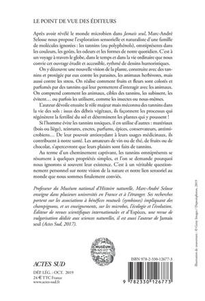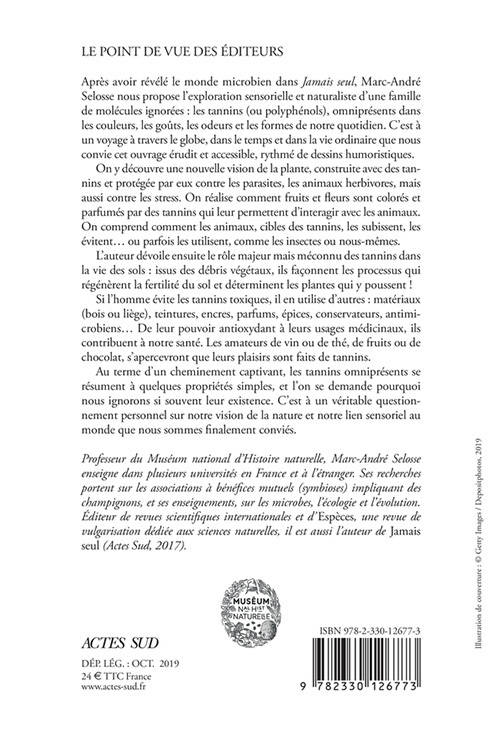 Après «Jamais seul», qui nous a fait découvrir le monde des microbes et leurs associations avec les plantes et les animaux, Marc- André Selosse nous propose, dans ce nouvel ouvrage, de cheminer avec lui dans le monde des tannins. Ces molécules font les goûts et les couleurs du monde, mais qui saurait dire qui sont les tannins et comment ils agissent ?