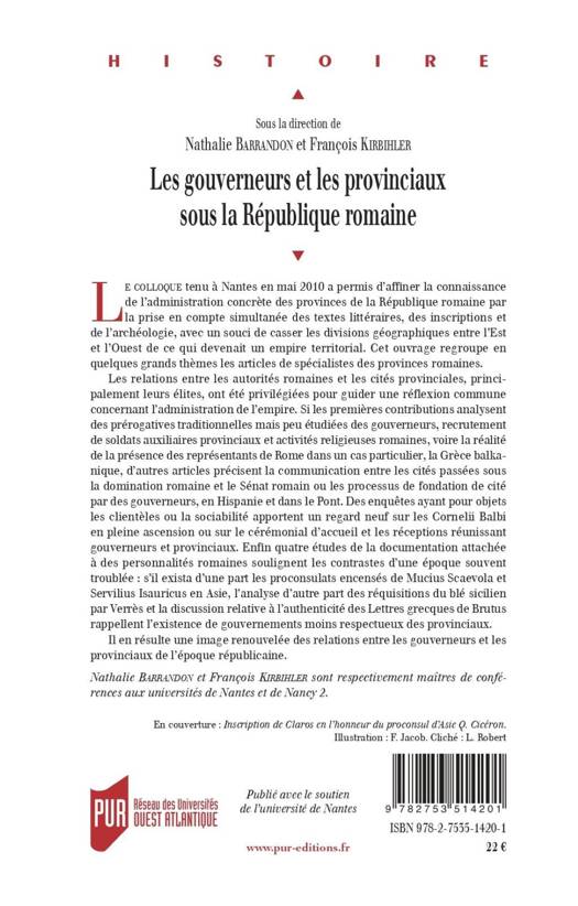Le colloque tenu à Nantes en mai 2010 a permis d’affiner la connaissance de l’administration concrète des provinces de la République romaine par la prise en compte simultanée des textes littéraires, des inscriptions et de l’archéologie, avec un souci de casser les divisions géographiques entre l’Est et l’Ouest de ce qui devenait un empire territorial. Cet ouvrage regroupe en quelques grands thèmes les articles de spécialistes des provinces romaines.