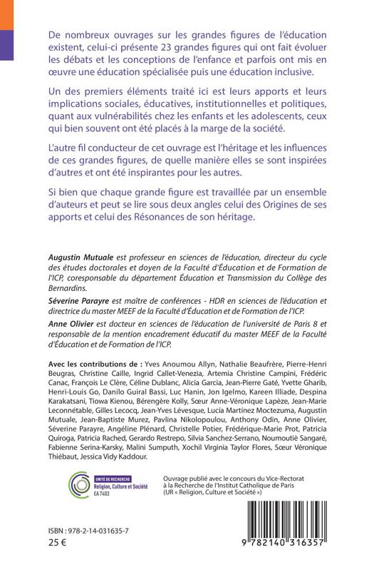 De nombreux ouvrages sur les grandes figures de l'éducation existent, celui-ci présente 23 grandes figures qui ont fait évoluer les débats et les conceptions de l'enfance et parfois ont mis en oeuvre une éducation spécialisée puis une éducation inclusive. Un des premiers éléments traité ici est leurs apports et leurs implications sociales, éducatives, institutionnelles et politiques, quant aux vulnérabilités chez les enfants et les adolescents, ceux qui bien souvent ont été placés à la marge de la société. L'autre fil conducteur de cet ouvrage est l'héritage et les influences de ces grandes figures, de quelle manière elles se sont inspirées d'autres et ont été inspirantes pour les autres. Si bien que chaque grande figure est travaillée par un ensemble d'auteurs et peut se lire sous deux angles celui des Origines de ses apports et celui des Résonances de son héritage.