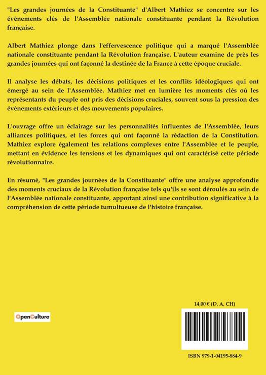Albert Mathiez plonge dans l'effervescence politique qui a marqué l'Assemblée nationale constituante pendant la Révolution française. L'auteur examine de près les grandes journées qui ont façonné la destinée de la France à cette époque cruciale.