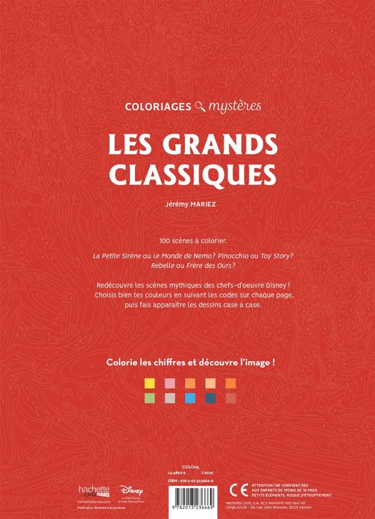 1 - CHOISIS TES OUTILS - crayons de couleur, feutres à eau ou feutres acryliques 2 - COLORIE LES NUMÉROS selon le code couleur pour révéler une magnifique illustration Disney ! 3 - PROFITE d'un moment de détente avec les livres de coloriage Hachette Heroes !