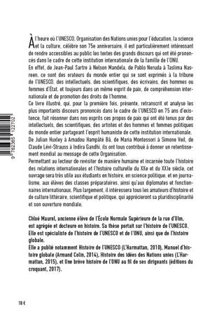 A l’heure où l’UNESCO célèbre son 75e anniversaire, ce livre rend accessibles au public es grands discours prononcés dans le cadre de cette institution internationale. En effet, de Jean-Paul Sartre à Nelson Mandela, de Pablo Neruda à Taslima Nasreen, ce sont des orateurs du monde entier qui se sont exprimés à la tribune de l’UNESCO, des intellectuels, des scientifiques, des écrivains, des hommes ou femmes d’État, et toujours dans un même esprit de paix, de compréhension internationale et de promotion des droits de l’homme.<br /> Ce livre présente les plus importants discours prononcés en 75 ans d’existence, fait résonner dans nos esprits ces propos de paix tenus par des intellectuels, des scientifiques, des artistes et des hommes et femmes politiques du monde entier.<br />