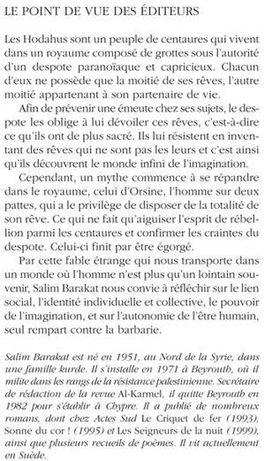 Les Hodahus sont un peuple de centaures qui vivent dans un royaume composé de grottes sous l'autorité d'un despote paranoïaque et capricieux. Chacun d'eux ne possède que la moitié de ses rêves, l'autre moitié appartenant à son partenaire de vie. Afin de prévenir une émeute chez ses sujets, le despote les oblige à lui dévoiler ces rêves, c'est-à-dire ce qu'ils ont de plus sacré. Ils lui résistent en inventant des rêves qui ne sont pas les leurs et c'est ainsi qu'ils découvrent le monde infini de l'imagination. Cependant, un mythe commence à se répandre dans le royaume, celui d'Orsine, l'homme sur deux pattes, qui a le privilège de disposer de la totalité de son rêve. Ce qui ne fait qu'aiguiser l'esprit de rébellion parmi les centaures et confirmer les craintes du despote. Celui-ci finit par être égorgé. Par cette fable étrange qui nous transporte dans un monde où l'homme n'est plus qu'un lointain souvenir, Salim Barakat nous convie à réfléchir sur le lien social, l'identité individuelle et collective, le pouvoir de l'imagination, et sur l'autonomie de l'être humain, seul rempart contre la barbarie. Salim Barakat est né en 1951, au Nord de la Syrie, dans une famille kurde. Il s'installe en 1971 à Beyrouth, où il milite dans les rangs de la résistance palestinienne. Secrétaire de rédaction de la revue Al-Karmel, il quitte Beyrouth en 1982 pour s'établir à Chypre. Il a publié de nombreux romans, dont chez Actes Sud Le Criquet de fer (1993), Sonne du cor ! (1995) et Les Seigneurs de la nuit (1999), ainsi que plusieurs recueils de poèmes. Il vit actuellement en Suède.