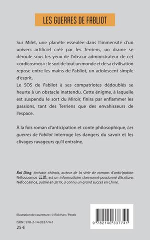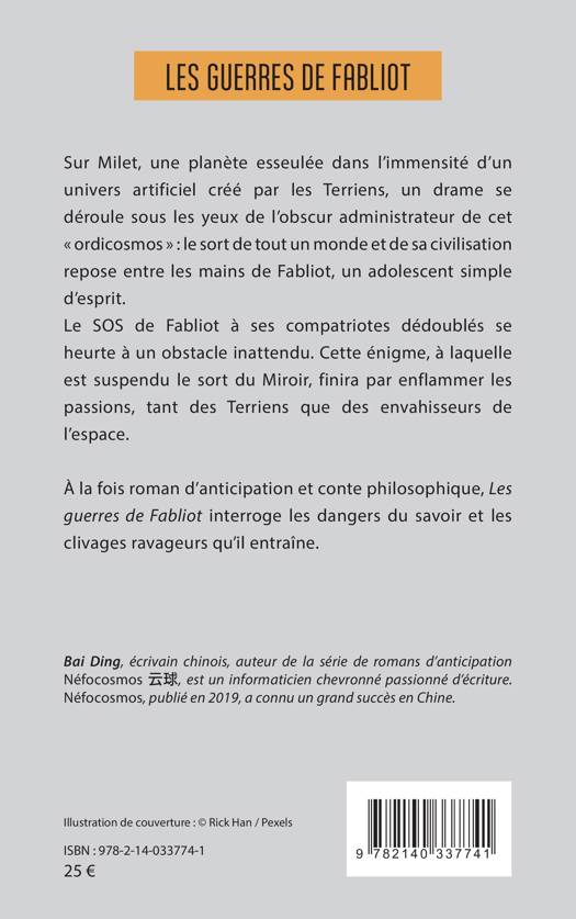 Sur Milet, une planète esseulée dans l'immensité d'un univers artificiel créé par les Terriens, un drame se déroule sous les yeux de l'obscur administrateur de cet ordicosmos: le sort de tout un monde et de sa civilisation repose entre les mains de Fabliot, un adolescent simple d'esprit. Le SOS de Fabliot à ses compatriotes dédoublés se heurte à un obstacle inattendu. Cette énigme, à laquelle est suspendu le sort du Miroir, finira par enflammer les passions, tant des Terriens que des envahisseurs de l'espace. À la fois roman d'anticipation et conte philosophique, Les guerres de Fabliot interroge les dangers du savoir et les clivages ravageurs qu'il entraîne.
