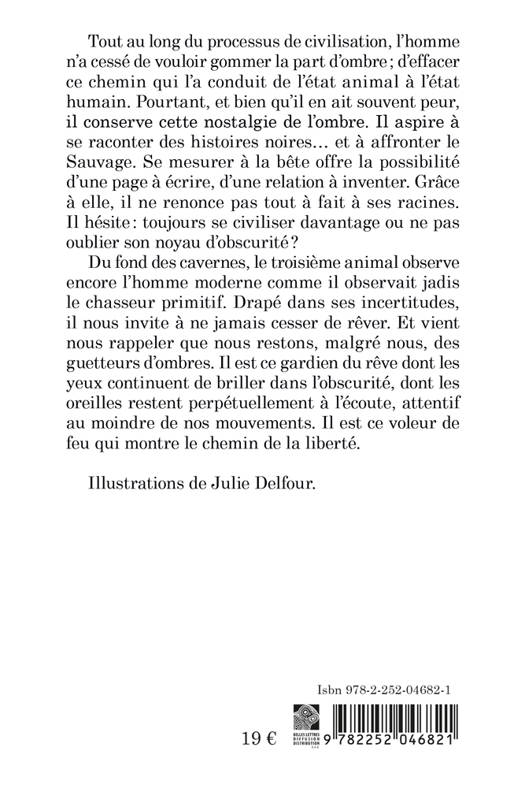 Tout au long du processus de civilisation, l'homme n'a cesse de vouloir gommer la part d'ombre; d'effacer ce chemin qui l'a conduit de l'etat animal a l'etat humain. Pourtant, et bien qu'il en ait souvent peur, il conserve cette nostalgie de l'ombre. Il aspire a se raconter des histoires noires... et a affronter le Sauvage. Se mesurer a la bete offre la possibilite d'une page a ecrire, d'une relation a inventer. Grace a elle, il ne renonce pas tout a fait a ses racines. Il hesite: toujours se civiliser davantage ou ne pas oublier son noyau d'obscurite? Du fond des cavernes, le troisieme animal observe encore l'homme moderne comme il observait jadis le chasseur primitif. Drape dans ses incertitudes, il nous invite a ne jamais cesser de rever. Et vient nous rappeler que nous restons, malgre nous, des guetteurs d'ombres. Il est ce gardien du reve dont les yeux continuent de briller dans l'obscurite, dont les oreilles restent perpetuellement a l'ecoute, attentif au moindre de nos mouvements. Il est ce voleur de feu qui montre le chemin de la liberte