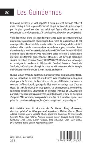 Les Guinéennes. Discriminations, liberté et émancipation : voilà des enjeux d'une très grande importance qui se posent aujourd'hui aux femmes guinéennes et africaines d'où l'idée de la rédaction de cet ouvrage collectif en vue de la revalorisation de leur image, de la visibilité de leurs efforts et de la reconnaissance de leurs apports dans les divers domaines de la vie. Qui n'a jamais entendu parler du mariage précoce ou du mariage forcé, du viol individuel ou collectif, du divorce avec répudiation sans aucun droit pour la femme, de l'excision et ses différentes variantes y compris l'infibulation, du gavage de filles avant le mariage sous d'autres cieux, de la maltraitance en tous genres, ce, uniquement parce qu'elles sont filles et femmes. L'humanité en général, l'Afrique et la Guinée en particulier ne sont-elles pas arrivées à un stade où la remise en question s'impose ? Ne sommes-nous pas dans une ère où il va falloir opérer une prise de conscience de genre, bref, un changement de paradigme ?