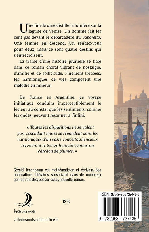 Une fine brume distille la lumière sur la lagune de Venise. Un homme fait les cent pas devant le débarcadère du vaporetto. Une femme en descend. Un rendez-vous pour deux, mais ce sont quatre destins qui s’entrecroisent. La trame d’une histoire plurielle se tisse dans ce roman choral vibrant de nostalgie, d’amitié et de sollicitude. Finement tressées, les harmoniques de vies composent une mélodie en mineur.