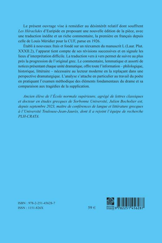 Le présent ouvrage vise à remédier au désintérêt relatif dont souffrent Les Héraclides d’Euripide en proposant une nouvelle édition de la pièce, avec une traduction inédite et un riche commentaire, la première en français depuis celle de Louis Méridier pour la CUF, parue en 1926.
