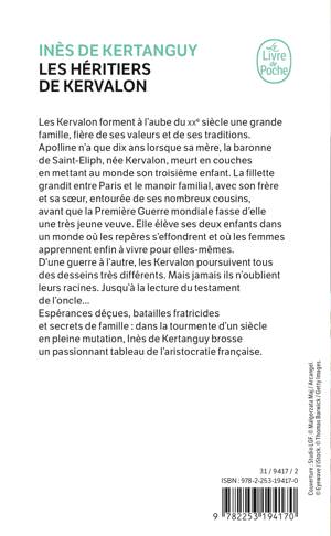 Les Kervalon forment à l'aube du XXe siècle une grande famille, fière de ses valeurs et de ses traditions. Apolline n'a que dix ans lorsque sa mère, la baronne de Saint-Eliph, née Kervalon, meurt en couches en mettant au monde son troisième enfant. La fillette grandit entre Paris et le manoir familial, avec son frère et sa sœur, entourée de ses nombreux cousins, avant que la Première Guerre mondiale fasse d'elle une très jeune veuve. Elle élève ses deux enfants dans un monde où les repères s'effondrent et où les femmes apprennent enfin à vivre pour elles-mêmes. D'une guerre à l'autre, les Kervalon poursuivent tous des desseins très différents. Mais jamais ils n’oublient leurs racines. Jusqu'à la lecture du testament de l'oncle... Espérances déçues, batailles fratricides et secrets de famille : dans la tourmente d'un siècle en pleine mutation, Inès de Kertanguy brosse un passionnant tableau de l'aristocratie française.