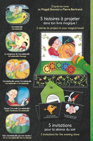 Pour endormir les tout-petits (et les plus grands), point de magie ! Découvrez les coffrets à histoires créées par Moulin Roty contenant 5 disques à emboîter et à projeter sur un mur pour se raconter de belles histoires en couleurs ! Avec les 5 petites invitations pour convier ses amis à la séance du soir, la soirée s'annonce grandiose ! 1 lampe, 5 disques contenant les histoires suivantes : "Cornebidouille, La vengeance de Cornebidouille, Cornebidouille contre Cornebidouille, Gloups ! J'ai avalé Cornebidouille, Non, Cornebidouille, pas mon doudou", 5 invitations, 1 joli coffret magnétique.