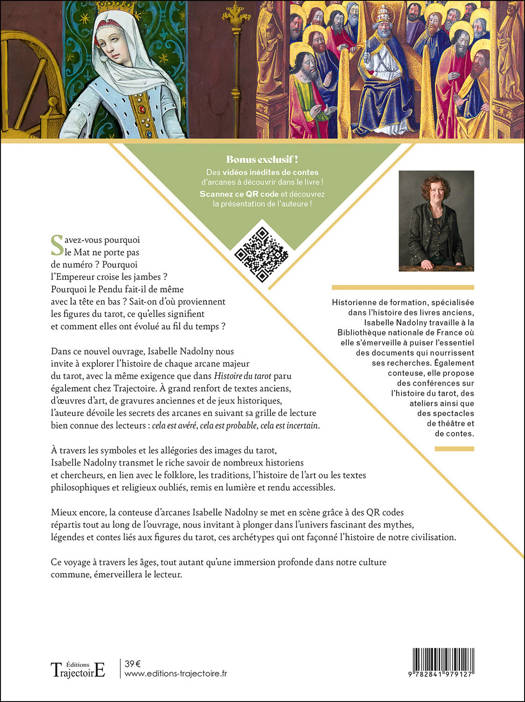Savez-vous pourquoi le Mat ne porte pas de numéro ? Sait-on d’où proviennent les figures du tarot, ce qu’elles signifient et comment elles ont évolué au fil du temps ? Dans ce nouvel ouvrage, Isabelle Nadolny nous invite à explorer l’histoire de chaque arcane majeur du tarot, avec la même exigence que dans Histoire du tarot paru également chez Trajectoire. À grand renfort de textes anciens, d’œuvres d’art, de gravures anciennes et de jeux historiques, l’auteure dévoile les secrets des arcanes en suivant sa grille de lecture bien connue des lecteurs : cela est avéré, cela est probable, cela est incertain. À travers les symboles et les allégories des images du tarot, Isabelle Nadolny transmet le riche savoir de nombreux historiens et chercheurs, en lien avec le folklore, les traditions, l’histoire de l’art ou les textes philosophiques et religieux oubliés, remis en lumière et rendu accessibles. Mieux encore, la conteuse d’arcanes Isabelle Nadolny se met en scène grâce à des QR codes répartis tout au long de l’ouvrage. Ce voyage à travers les âges, tout autant qu’une immersion profonde dans notre culture commune, émerveillera le lecteur.