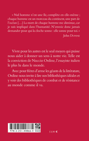 Nul homme n'est une ile, complete en elle-meme; chaque homme est un morceau du continent, une part de l'ocean [...] La mort de chaque homme me diminue, car je suis implique dans l'humanite. N'envoie donc jamais demander pour qui la cloche sonne: elle sonne pour toi. John DONNEVivre pour les autres est le seul moyen qui puisse nous aider a donner un sens a notre vie. Telle est la conviction de Nuccio Ordine, l'essayiste italien le plus lu dans le monde. Avec pour freres d'arme les geants de la litterature, Ordine nous invite a lire nos bibliotheques ideales et y voir des bibliotheques de combat et de resistance au monde comme il va.