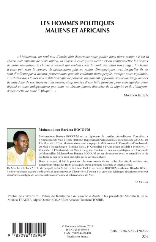 Dans ce livre, l'auteur fait le point sur plusieurs années de ses recherches afin de restituer aux générations futures les fruits de sa quête sur la politique nationale et internationale. De Modibo Keïta à A.T.T., de Léopold Sédar Senghor à Jean-Paul II, de Baréma Bocoum à Alioune Blondin Bèye, à travers quelques extraits de discours, d'interventions et d'interviews, l'auteur a su créer des éclairages historiques pour tout observateur-analyste de la scène nationale africaine et internationale du Mali.