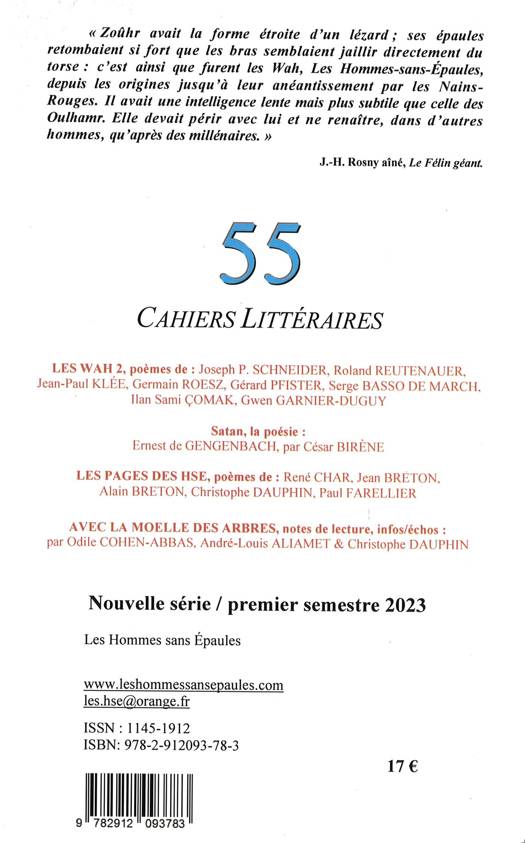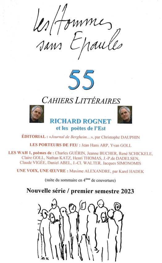 Ce numéro des Hommes sans Épaules est consacré à l’Est et à ses poètes autour de l’Alsace et de la Lorraine… De cette Alsace nous retenons, choix forcément restreint et non exhaustif, dans notre numéro douze poètes et non des moindres puisqu’il s’agit de l’immense peintre-poète-sculpteur Jean Hans Arp, puis Maxime Alexandre, poète juif alsacien surréaliste communiste puis chrétien (quel parcours !), Nathan Katz, poète dialectal méconnu, à tort, le météore Jean-Paul de Dadelsen, Claude Vigée, Joseph Paul Schneider, Jean-Claude Walter, Roland Reutenauer, Jean-Paul Klée, Jacques Simonomis le poète du Cri d’os, Germain Roesz et Gérard Pfister, poète qui a aussi développé un impressionnant catalogue, éditorial, à la magnifique enseigne d’Arfuyen, depuis 1975.
