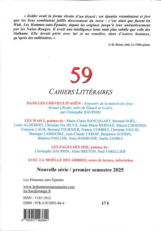 Éditorial : « Permis de séjour, de Bucarest au pays des Causses », par Christophe DAUPHIN / Ainsi furent les Wah 1 : Poèmes de Christophe DAUPHIN, Jean-Henri FABRE, François FABIE, Henri TERRAL, Eugène VIALA, Roger FRENE, Christiane BURUCOA, Gérard CANTALOUBE, Jean DIGOT, Denys-Paul BOULOC, Georges et Jean SUBERVIE, Jean SENAC, Claude SERNET / Dossier : « Ilarie VORONCA & les poètes du Rouergue », par Christophe DAUPHIN / Ainsi furent les Wah 2 : Poèmes de Marie-Claire BANCQUART, Bernard NOËL, Louis ALDEBERT, Christian DA SILVA, Anne-Marie BERNAD, Marcel CHINONIS, François LAUR, Bernard FOURNIER, Francis COMBES, Christian VIGUIE, Monique W. LABIDOIRE, Jean-Claude TARDIF, Benjamin GUERIN, Béatrice PAILLER, Anne BARBUSSE, Sacha ZAMKA / Souvenirs de la maison des fous (prose) : « ARTAUD à Rodez », suivi de « Paul ELUARD en Lozère », par Christophe DAUPHIN / Les pages libres des Hommes sans Épaules : Poèmes de Christophe DAUPHIN, Alain BRETON, Paul FARELLIER / Avec la moelle des arbres : Notes de lecture de : Christophe DAUPHIN, Pierrick de CHERMONT, Odile COHEN-ABBAS / Infos / Échos des HSE : avec des textes de Christophe DAUPHIN, Madeleine RIFFAUD, Jean ROUSSELOT, Alain BRETON, Marie-Josée CHRISTIEN, Gyula ILLYES, Karel HADEK, Alexandre VOISARD, Jean-Luc MAXENCE, Odile COHEN-ABBAS, César BIRÈNE, André BRETON, Sarane ALEXANDRIAN, Daniel ABEL, Boualem SANSAL, Pierre DE RONSARD, Joaquim DU BELLAY