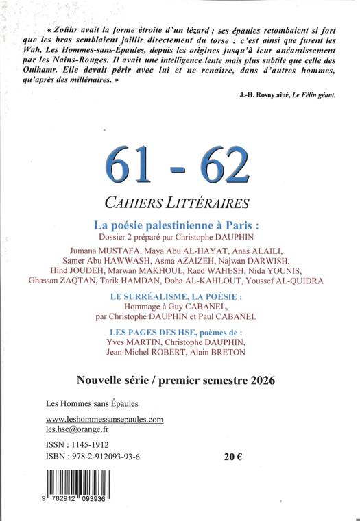 Le premier dossier de ce numéro des Hommes sans Épaules rend, ensuite, hommage, quinze ans après sa disparition, à l’âge de soixante-quatre ans, à un poète insulaire, qui est une légende (méconnue, mais réelle), à un mythe, à un poète qui ne s’est jamais compromis au regard de ses valeurs et du mode de vie qu’il avait choisi. Un homme qui a toujours privilégié la vie, le vivre, l’amitié et l’amour, avant d’écrire et de peindre, et c’est, sans doute, ce qui le rend si personnel, à part : Je porte à la saignée du coude une marque par le feu – Qui prouve que je vous appartiens et que vous m’appartenez.