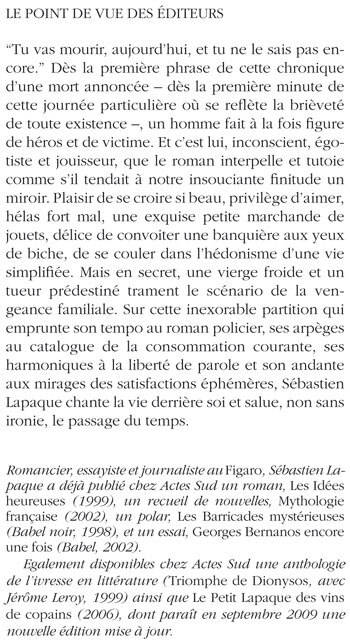 "Tu vas mourir, aujourd'hui, et tu ne le sais pas encore." Dès la première phrase de cette chronique d'une mort annoncée - dès la première minute de cette journée particulière où se reflète la brièveté de toute existence -, un homme fait à la fois figure de héros et de victime. Et c'est lui, inconscient, égotiste et jouisseur, que le roman interpelle et tutoie comme s'il tendait à notre insouciante finitude un miroir. Plaisir de se croire si beau, privilège d'aimer, hélas fort mal, une exquise petite marchande de jouets, délice de convoiter une banquière aux yeux de biche, de se couler dans l'hédonisme d'une vie simplifiée. Mais en secret, une vierge froide et un tueur prédestiné trament le scénario de la vengeance familiale. Sur cette inexorable partition qui emprunte son tempo au roman policier, ses arpèges au catalogue de la consommation courante, ses harmoniques à la liberté de parole et son andante aux mirages des satisfactions éphémères, Sébastien Lapaque chante la vie derrière soi et salue, non sans ironie, le passage du temps.