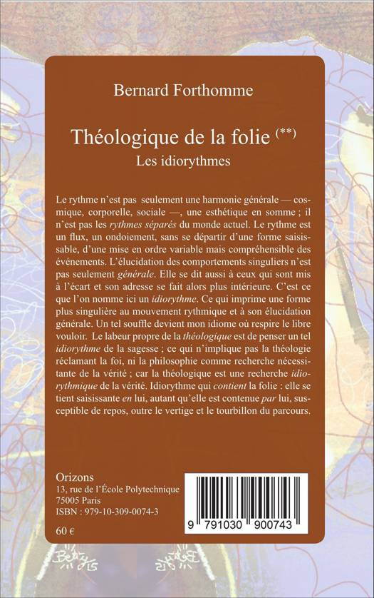 Le rythme n'est pas seulement une harmonie générale cosmique, corporelle, sociale , une esthétique en somme ; il n'est pas les rythmes séparés du monde actuel. Le rythme est un flux, un ondoiement, sans se départir d'une forme saisissable, d'une mise en ordre variable mais compréhensible des événements. L'élucidation des comportements singuliers n'est pas seulement générale. Elle se dit aussi à ceux qui sont mis à l'écart et son adresse se fait alors plus intérieure. C'est ce que l'on nomme ici un idiorythme. La théologique est une recherche idiorythmique de la vérité.