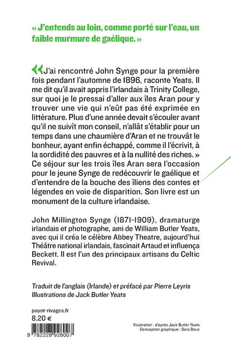 "J'ai rencontré John Synge pour la première fois pendant l'automne de 1896, raconte Yeats. Il me dit qu'il avait appris l'irlandais à Trinity College, sur quoi je le pressai d'aller aux îles Aran pour y trouver une vie qui n'eût pas été exprimée en littérature. Plus d'une année devait s'écouler avant qu'il ne suivît mon conseil, n'allât s'établir pour un temps dans une chaumière d'Aran et ne trouvât le bonheur, ayant enfin échappé, comme il l'écrivit, à la sordidité des pauvres et à la nullité des riches." Ce séjour sur les trois îles Aran sera l'occasion pour le jeune Synge de redécouvrir le gaélique, d'entendre de la bouche des îliens des contes et légendes en voie de disparition ailleurs en Irlande, et de s'approcher d'un monde primitif que d'autres, à la même époque, partaient chercher aux antipodes. Son livre est un monument de la culture irlandaise.
