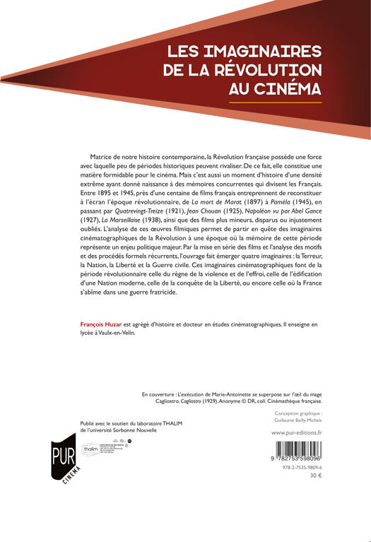 Matrice de notre histoire contemporaine, la Révolution française possède une force avec laquelle peu de périodes historiques peuvent rivaliser. De ce fait, elle constitue une matière formidable pour le cinéma. Mais c’est aussi un moment d’histoire d’une densité extrême ayant donné naissance à des mémoires concurrentes qui divisent les Français. Entre 1895 et 1945, près d’une centaine de films français entreprennent de reconstituer à l’écran l’époque révolutionnaire, de La mort de Marat (1897) à Paméla (1945), en passant par Quatre-vingt-Treize (1921), Jean Chouan (1925), Napoléon vu par Abel Gance (1927), La Marseillaise (1938), ainsi que des films plus mineurs, disparus ou injustement oubliés. L’analyse de ces oeuvres filmiques permet de partir en quête des imaginaires cinématographiques de la Révolution à une époque où la mémoire de cette période représente un enjeu politique majeur. Par la mise en série des films et l’analyse des motifs et des procédés formels récurrents, l’ouvrage fait émerger quatre imaginaires : la Terreur, la Nation, la Liberté et la Guerre civile. Ces imaginaires cinématographiques font de la période révolutionnaire celle du règne de la violence et de l’effroi, celle de l’édification d’une Nation moderne, celle de la conquête de la Liberté, ou encore celle où la France s’abîme dans une guerre fratricide.