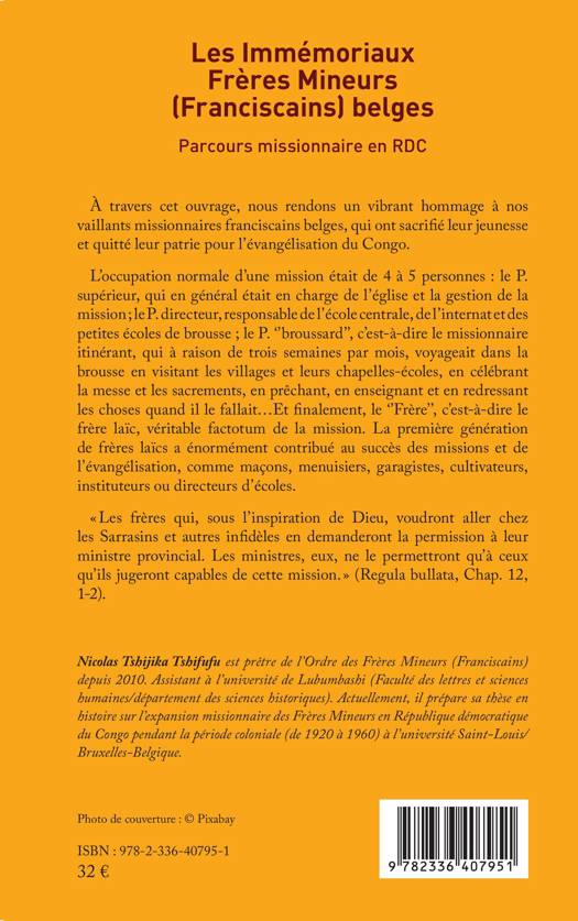 À travers cet ouvrage, nous rendons un vibrant hommage à nos vaillants missionnaires franciscains belges, qui ont sacrifié leur jeunesse et quitté leur patrie pour l’évangélisation du Congo. L’occupation normale d’une mission était de 4 à 5 personnes : le P. supérieur, qui en général était en charge de l’église et la gestion de la mission ; le P. directeur, responsable de l’école centrale, de l’internat et des petites écoles de brousse ; le P. ‘’broussard’’, c’est-à-dire le missionnaire itinérant, qui à raison de trois semaines par mois, voyageait dans la brousse en visitant les villages et leurs chapelles-écoles, en célébrant la messe et les sacrements, en prêchant, en enseignant et en redressant les choses quand il le fallait...Et finalement, le ‘’Frère’’, c’est-à-dire le frère laïc, véritable factotum de la mission. La première génération de frères laïcs a énormément contribué au succès des missions et de l’évangélisation, comme maçons, menuisiers, garagistes, cultivateurs, instituteurs ou directeurs d’écoles.