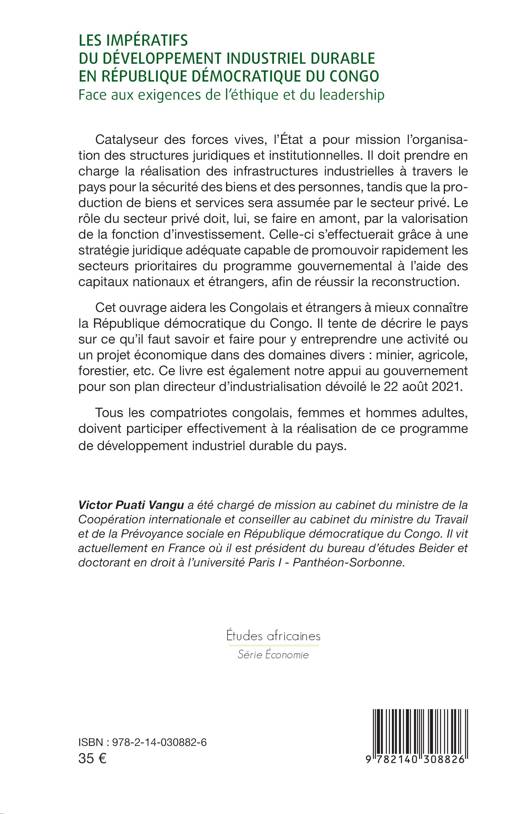 Catalyseur des forces vives, l'État a pour mission l'organisation des structures juridiques et institutionnelles. Il doit prendre en charge la réalisation des infrastructures industrielles à travers le pays pour la sécurité des biens et des personnes, tandis que la production de biens et services sera assumée par le secteur privé. Le rôle du secteur privé doit, lui, se faire en amont, par la valorisation de la fonction d'investissement. Celle-ci s'effectuerait grâce à une stratégie juridique adéquate capable de promouvoir rapidement les secteurs prioritaires du programme gouvernemental à l'aide des capitaux nationaux et étrangers, afin de réussir la reconstruction. Cet ouvrage aidera les Congolais et étrangers à mieux connaître la République démocratique du Congo. Il tente de décrire le pays sur ce qu'il faut savoir et faire pour y entreprendre une activité ou un projet économique dans des domaines divers: minier, agricole, forestier, etc. Ce livre est également notre appui au gouvernement pour son plan directeur d'industrialisation dévoilé le 22 août 2021. Tous les compatriotes congolais, femmes et hommes adultes, doivent participer effectivement à la réalisation de ce programme de développement industriel durable du pays.