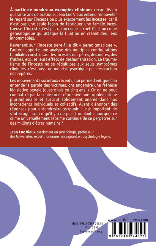 L’inceste est un crime contre la famille et l’humanisation autant qu’un crime de sexe. L’originalité de ce livre est de montrer, en s’appuyant sur de nombreux cas cliniques, que l’inceste détruit les liens familiaux sur plusieurs générations. Revenant sur l’inceste père-fille, dit « paradigmatique », l’auteur apporte une analyse des multiples figures du père dans l’inceste, de l’inceste fraternel, de la part des mères, mais interroge également(ce terrible héritage qui percute les générations. Le traumatisme de l’inceste ne se réduit pas aux seuls symptômes cliniques, c’est aussi un meurtre psychique par destruction des repères. L’ouvrage souligne par ailleurs l’ambiguïté des lois et des abords sociétaux sur ce sujet.