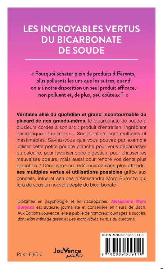 « Pourquoi acheter plein de produits différents, plus polluants les uns que les autres, quand on a à notre disposition un seul produit efficace, non polluant et, de plus, peu coûteux ? » Véritable allié du quotidien et grand incontournable du placard de nos grands-mères, le bicarbonate de soude a plusieurs cordes à son arc : produit d’entretien, ingrédient cosmétique et culinaire… Ses bienfaits sont multiples et inestimables. Saviez-vous que vous pouvez par exemple utiliser cette petite poudre blanche pour vous débarrasser du calcaire, pour favoriser votre digestion, pour chasser les mauvaises odeurs, mais aussi pour rendre vos dents plus blanches ? Découvrez ou redécouvrez sans plus attendre ses multiples vertus et utilisations possibles grâce aux conseils, infos et astuces d’Alessandra Moro Buronzo qui fera de vous un nouvel adepte du bicarbonate !