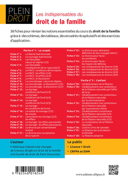 38 fiches pour réviser les notions essentielles du cours du droit de la famille grâce à : des schémas, des tableaux, des encadrés récapitulatifs et des exercices d'application.