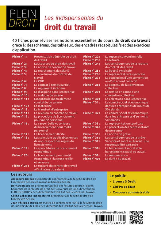 40 fiches pour réviser les notions essentielles du cours de droit du travail grâce à : des schémas, des tableaux, des encadrés récapitulatifs et des exercices d'application (cas pratiques).