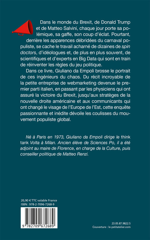 Dans ce livre, Giuliano da Empoli brosse le portrait de ces ingénieurs du chaos. Du récit incroyable de la petite entreprise de webmarketing devenue le premier parti italien, en passant par les physiciens qui ont assuré la victoire du Brexit, jusqu’aux stratèges de la nouvelle droite américaine et aux communicants qui ont changé le visage de l’Europe de l’Est, cette enquête passionnante et inédite dévoile dévoile les coulisses du mouvement populiste global.
