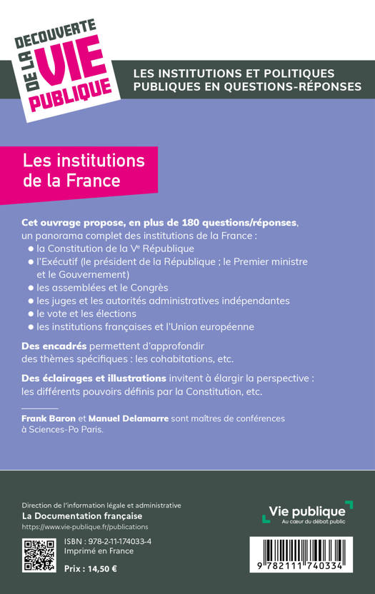 Cet ouvrage présente, de manière synthétique, les principaux « piliers institutionnels français" : la Constitution de la Ve République et les pouvoirs exécutif et législatif. Il montre comment ils s’articulent, et expose de façon claire et approfondie leur place centrale dans l’élaboration de la loi.