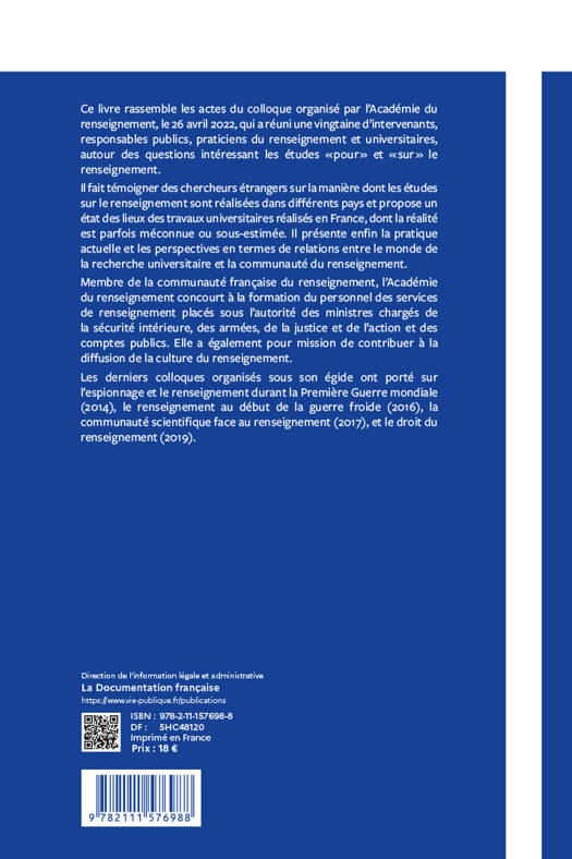 Cet ouvrage rassemble les actes du colloque du 22 avril 2022 organisé par l’Académie du renseignement réunissant des membres de la communauté du renseignement et des personnalités du monde académique. Ce livre retrace les grandes étapes qui jalonnent l’histoire et présente les études des chercheurs étrangers sur le renseignement dans différents pays. Il propose par ailleurs un état des lieux des travaux en France dont la réalité est méconnue ; et pose des questions sur les perspectives en terme de relations, entre le monde de la recherche universitaire et la communauté du renseignement.