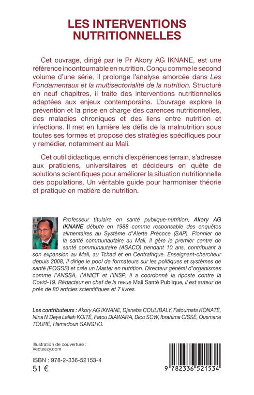 Cet ouvrage, dirigé par le Pr Akory AG IKNANE, est une référence incontournable en nutrition. Conçu comme le second volume d'une série, il prolonge l'analyse amorcée dans Les Fondamentaux et la multisectorialité de la nutrition. Structuré en neuf chapitres, il traite des interventions nutritionnelles adaptées aux enjeux contemporains. L'ouvrage explore la prévention et la prise en charge des carences nutritionnelles, des maladies chroniques et des liens entre nutrition et infections. Il met en lumière les défis de la malnutrition sous toutes ses formes et propose des stratégies spécifiques pour y remédier, notamment au Mali. Cet outil didactique, enrichi d'expériences terrain, s'adresse aux praticiens, universitaires et décideurs en quête de solutions scientifiques pour améliorer la situation nutritionnelle des populations. Un véritable guide pour harmoniser théorie et pratique en matière de nutrition.